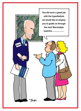 Glenn Cockram, Manager Community Infrastructure, CFA District 14 led us through a scenario where a fire was initiated in the area of Mt Pleasant Rd, Eltham and travelled into Warrandyte and North Warrandyte. During the scenario we were continually challenged. “And what would you be doing now? What does your plan say?”
